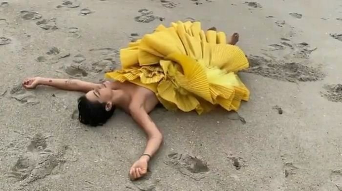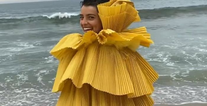 Se trata de un vestido amarillo con importantes pliegues que lució sobre la playa, mientras baile y sonríe a la cámara.