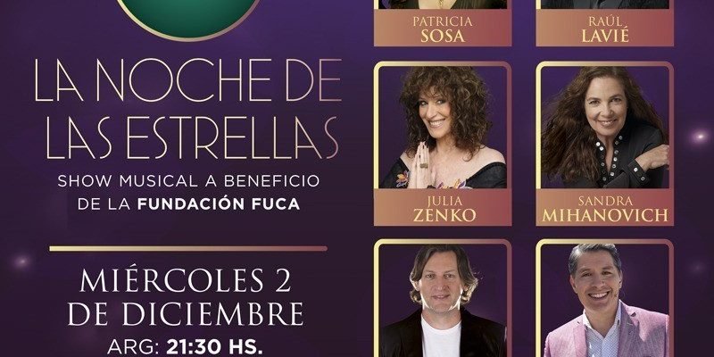 Las estrellas brillarán en la noche de FUCA: Raúl Lavié, Sandra Mihanovich, Julia Zenko, Jorge Vázquez y Patricia Sosa cantarán por FUCA sus más lindas canciones, las de siempre, esas que nos hacen soñar y emocionarnos cada vez que las escuchamos. Nos regalarán su música y su talento, para que vos nos acompañes en esta noche maravillosa. El anfitrión del evento será Guillermo Lobo.