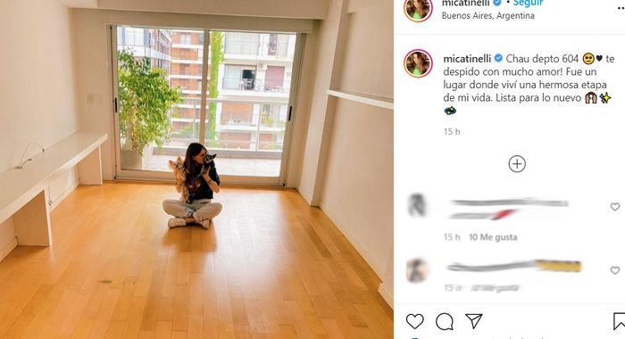 “Chau depto 604, te despido con mucho amor! Fue un lugar donde viví una hermosa etapa de mi vida. Lista para lo nuevo”, escribió Mica para despedirse de su antiguo hogar junto a una foto de lo que fue su living.
