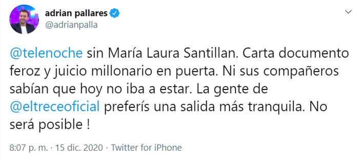 “@telenoche sin María Laura Santillan. Carta documento feroz y juicio millonario en puerta. Ni sus compañeros sabían que hoy no iba a estar. La gente de @eltreceoficial preferís una salida más tranquila. No será posible!”, tuiteó Pallares en su cuenta personal.