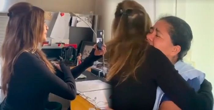 También, la integrante de El Club del Moro, La 100, e abrazó con la empleada que trabaja en su casa, que muy contenta le dice: “Es un regalo que usted se merecía”.